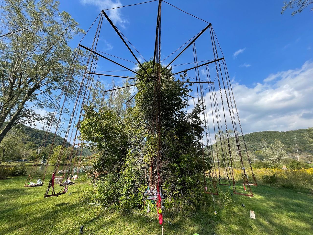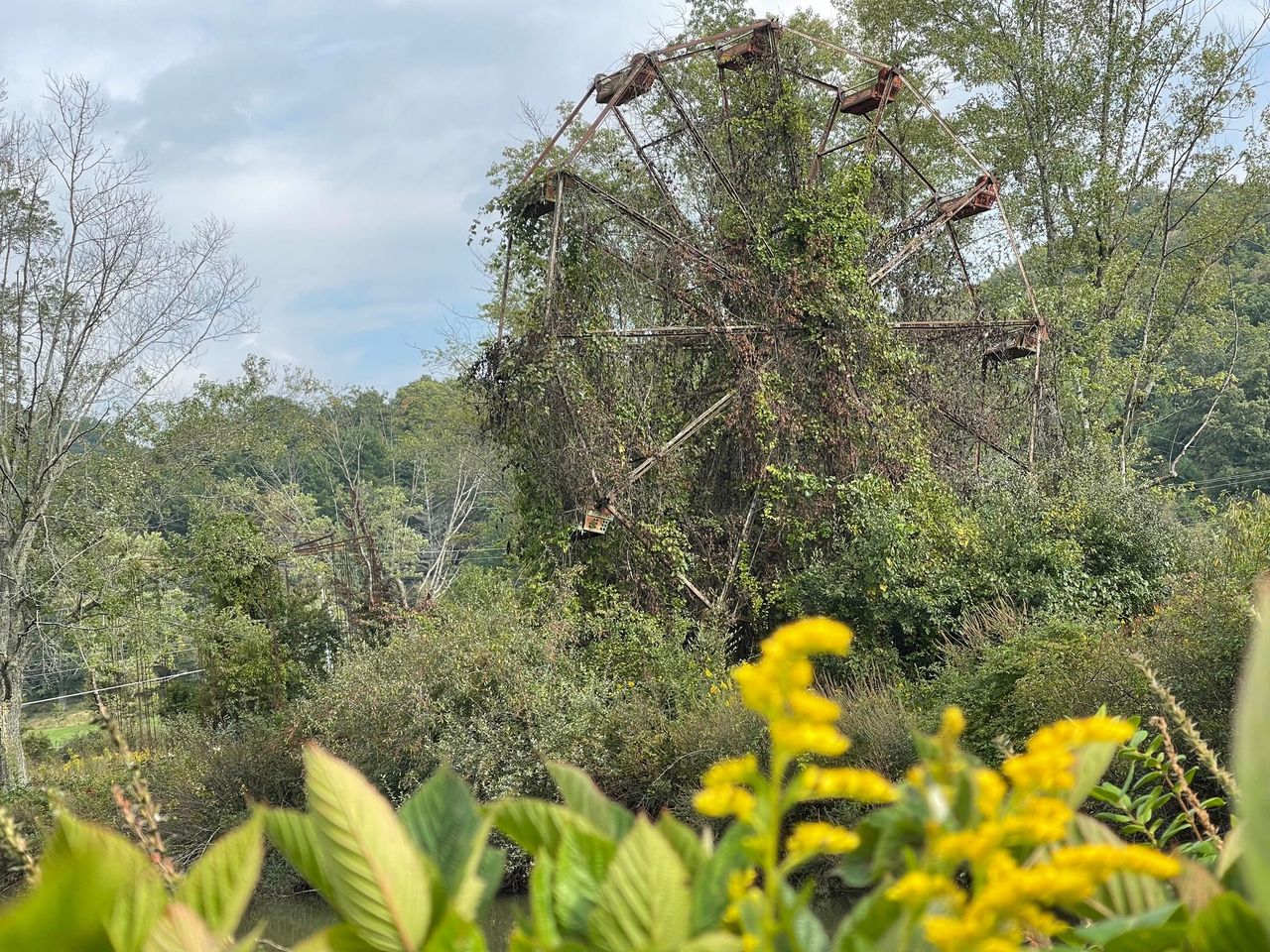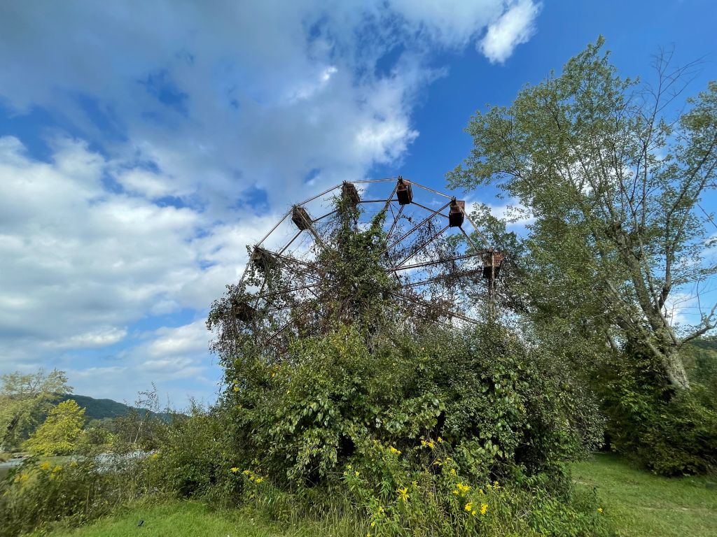 As we were there nothing stood out as overtly paranormal to us, but was very interesting and uncanny in some parts. We started our small hike around the giant looming Ferris wheel which now creeks and moans in the wind, completely overtaken by vines. This was a beautiful thing to document and see first hand.